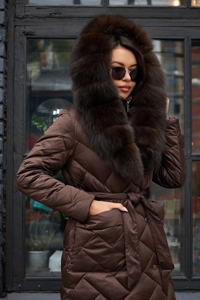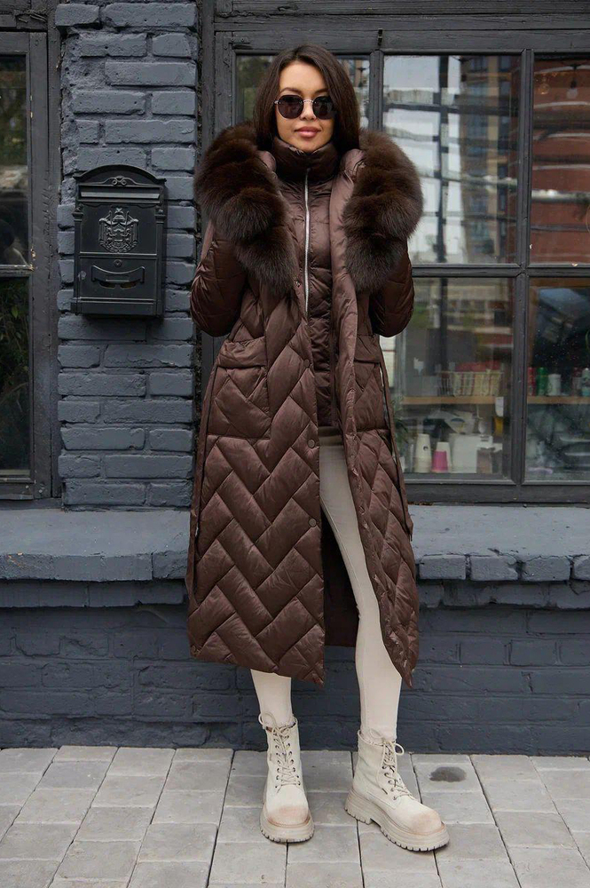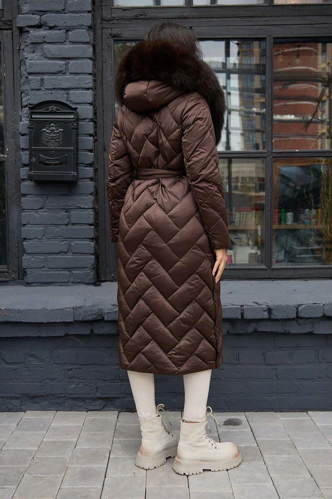 Длинный коричневый пуховик Vivilona выполнен из высококачественного материала, обеспечивающего тепло и комфорт в холодную погоду. Большой мех песца на капюшоне и воротнике не только добавляет стильности, но и надежно защищает от ветра и мороза. Модель украшена декоративной строчкой в виде кирпичиков, придающей ей современный и оригинальный вид. Пояс позволяет регулировать посадку по фигуре, создавая эффектный силуэт. Внутри расположена манишка с воротником-стойкой, которая дополнительно сохраняет тепло и обеспечивает комфорт при ношении. Этот пуховик идеально подойдет для тех, кто ценит стиль, качество и тепло в зимний сезон.