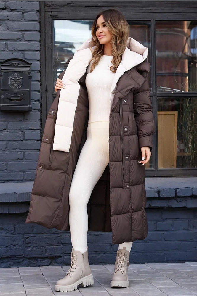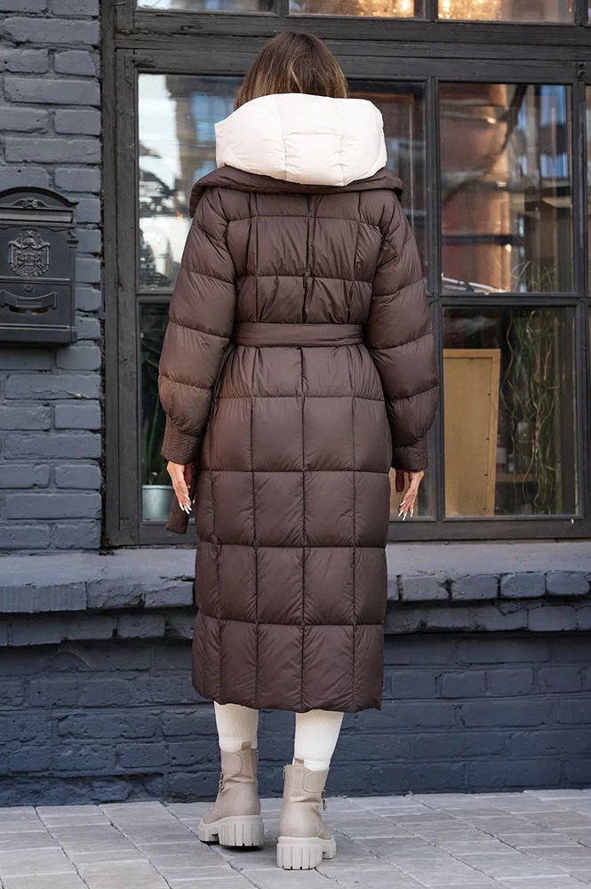 Длинное пуховое пальто на зиму 2025-2026 годов коричневого цвета с манишкой цвета слоновая кость. Модель выполнена из теплого наполнителя из пуха и пера, обеспечивающего отличную теплоизоляцию. Пальто оснащено удобной застежкой-молнией и кнопками для надежной защиты от холода. В комплект входит пояс, который позволяет подчеркнуть талию и создать элегантный силуэт. Благодаря своему длинному крою и стильному дизайну, это пальто станет отличным выбором для холодных зимних дней, сочетая комфорт, функциональность и современный стиль.