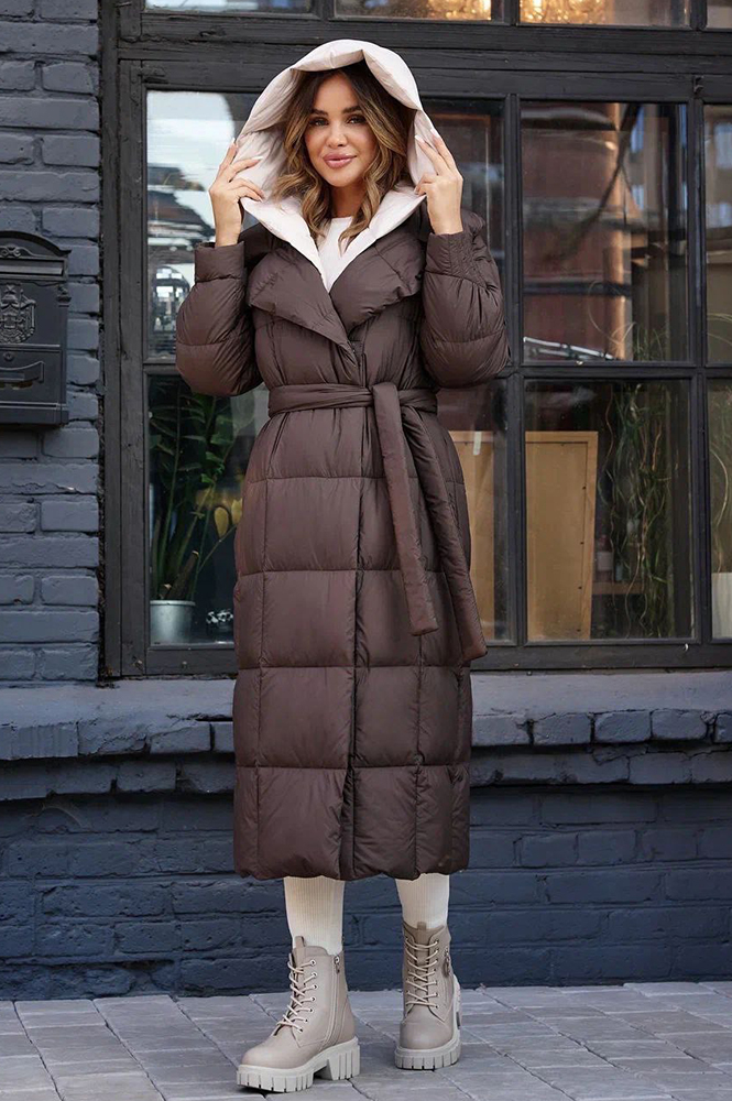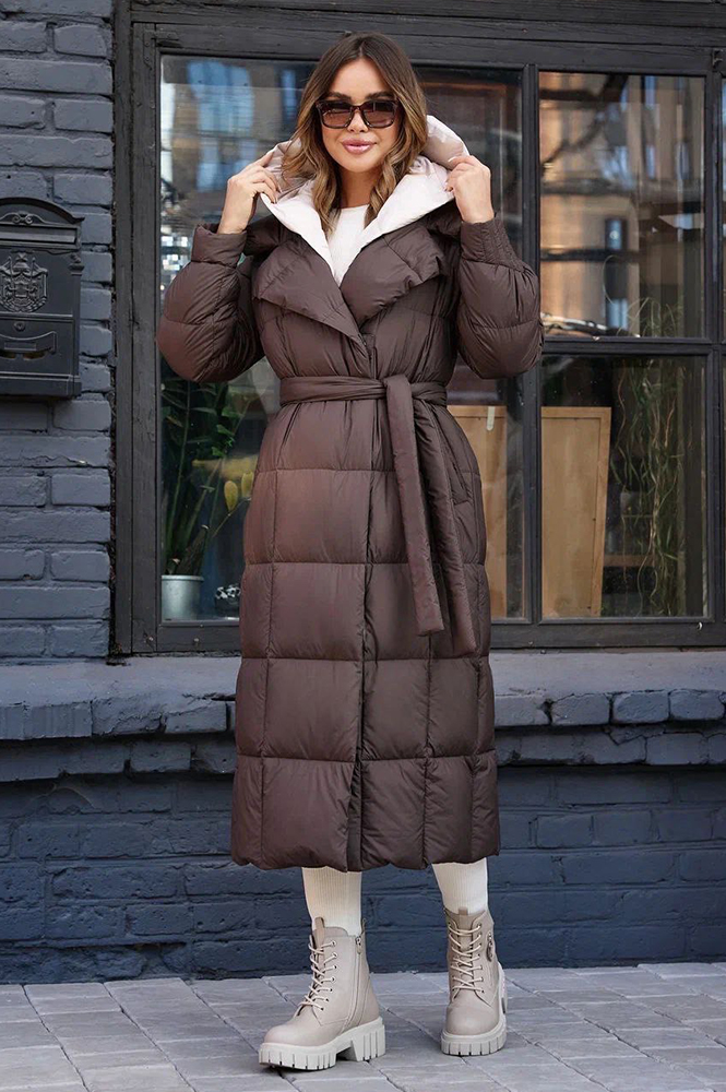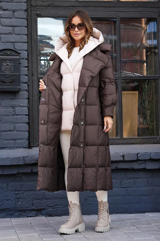 Длинное пуховое пальто зима 2025-2026 коричневое купить в Москве