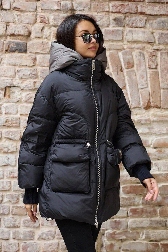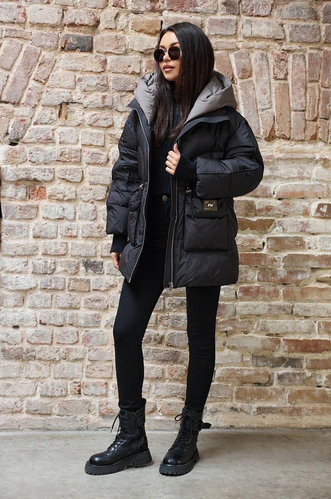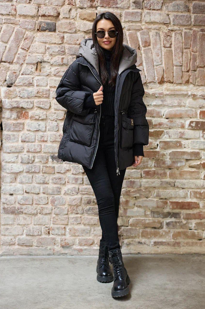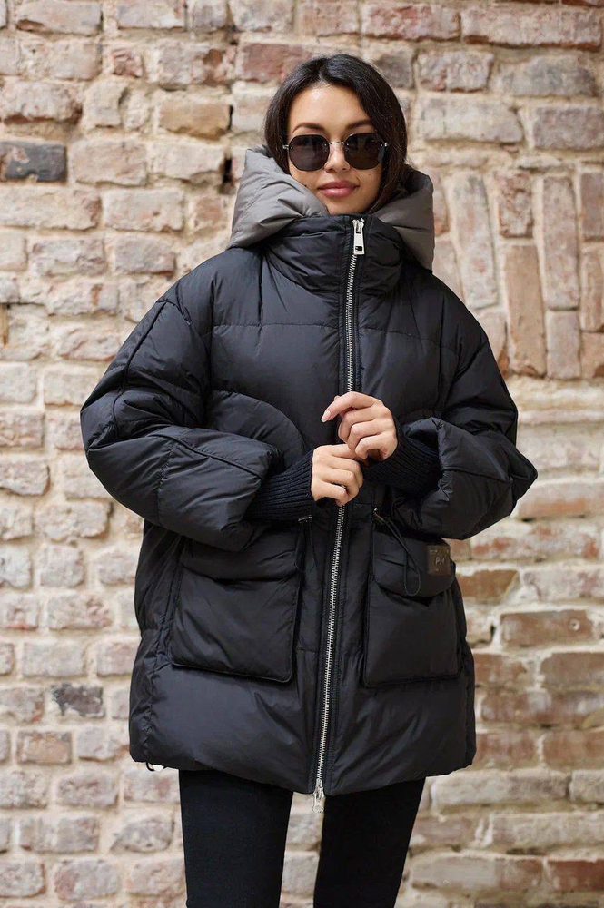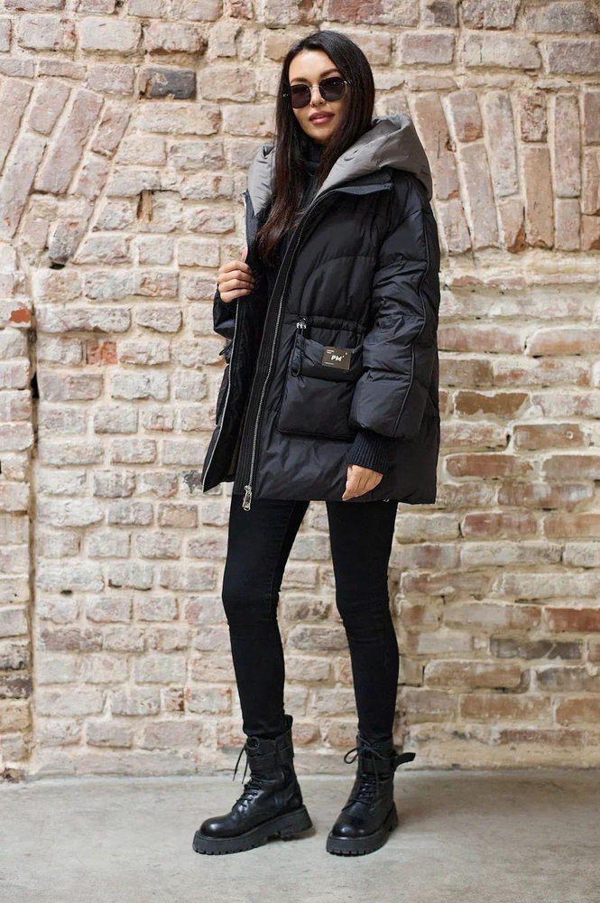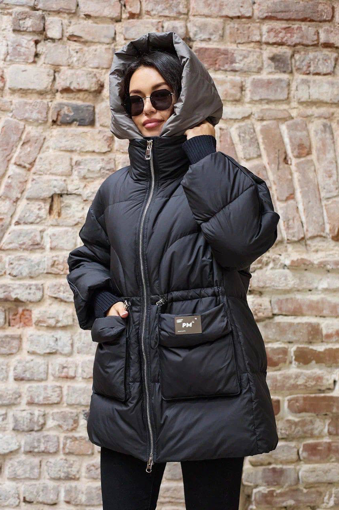 Пуховое пальто черного цвета с магнитными кнопками купить в Москве