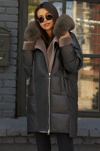 Изделие длинной ниже колена из плотной ткани. на спине втачной капюшон и декорация мехом. Окрас меха натуральный, хорошо сочетается с цветом ткани. Утеплен пуховик пуховым пакетом. Рукава с тканевыми манжетами. Бренд изделия - btn button.