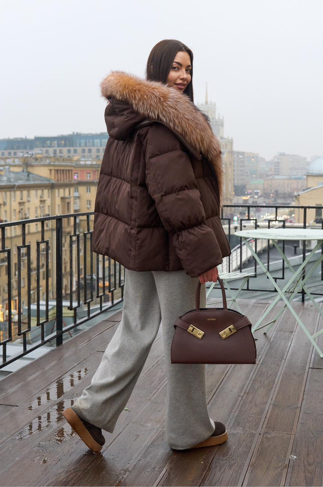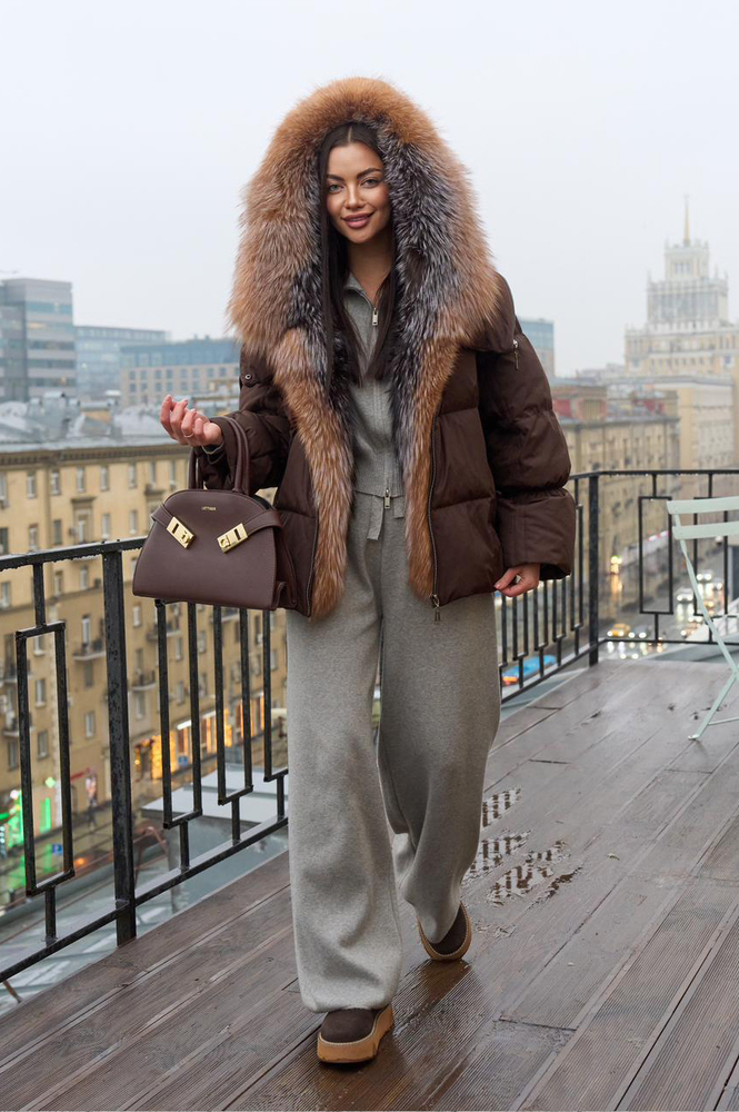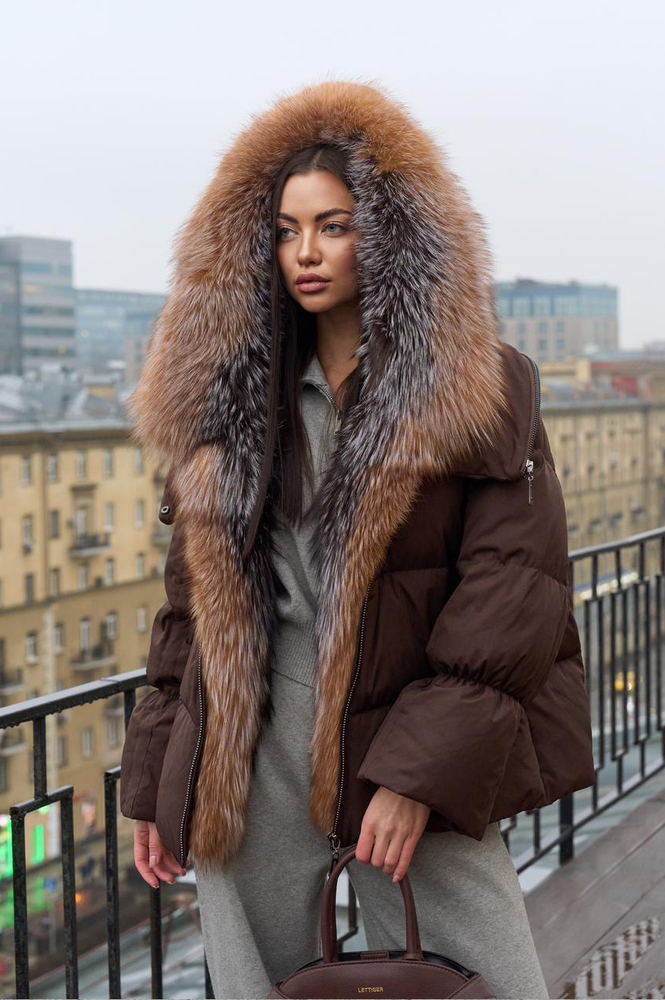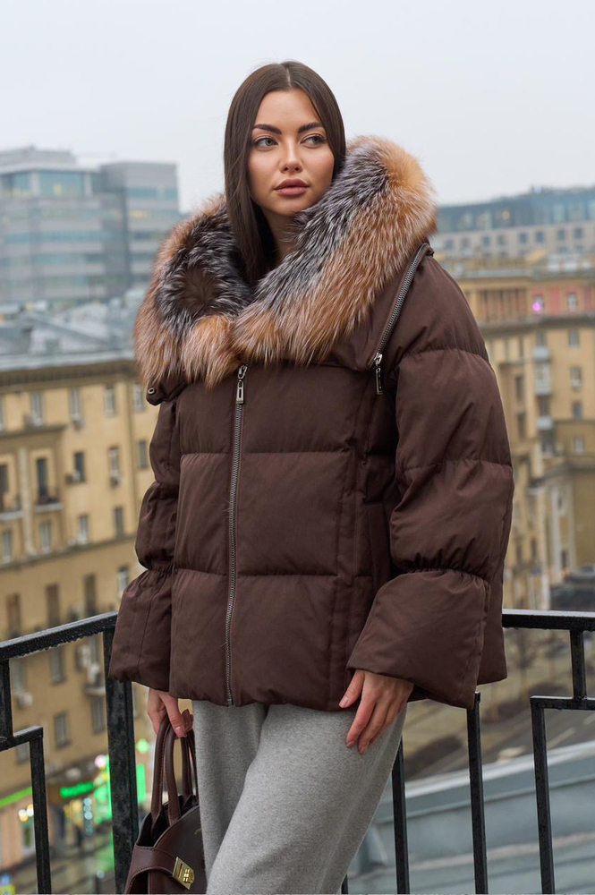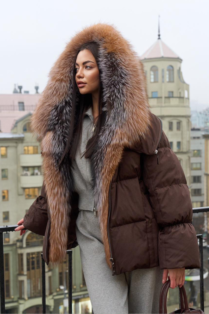 Дутое пуховое пальто от Tannossto коричневого цвета. Модель оснащена капюшоном и выполнена с мехом чернобурой лисы по краю капюшона и вдоль молнии. Внутри пальто наполнитель из пуха и пера для максимального тепла и комфорта. Рукава широкие с трикотажными манжетами, что обеспечивает хорошую посадку и теплоизоляцию. Воротник широкий и отложной, добавляющий стилю элегантности и уюта. Отличный выбор для холодных зимних дней, сочетающий функциональность и современный дизайн.