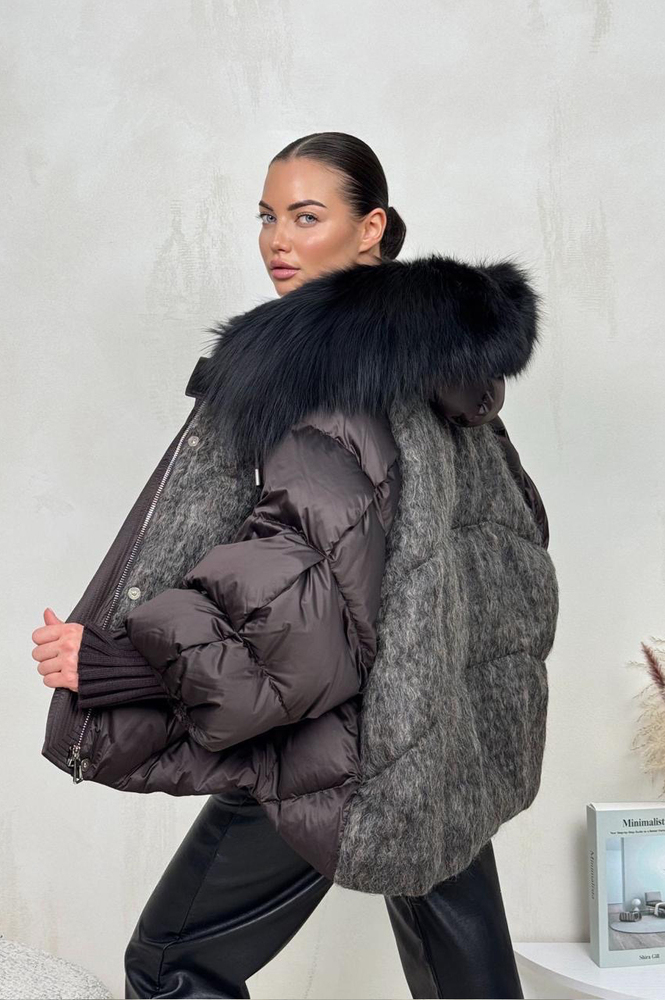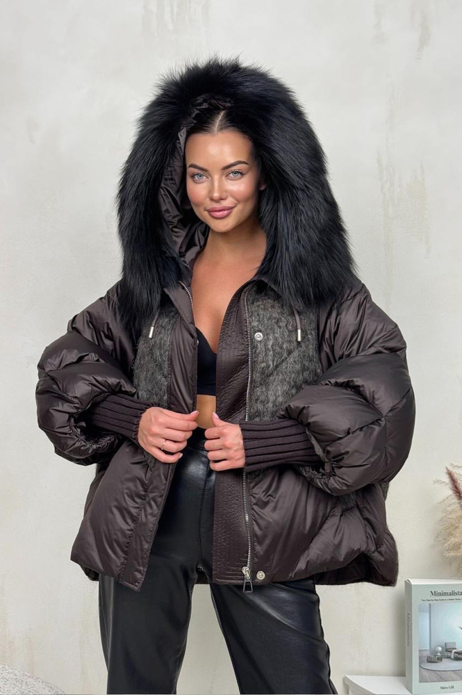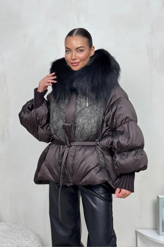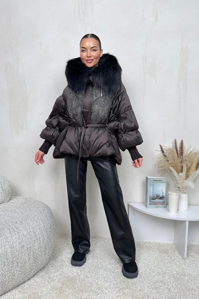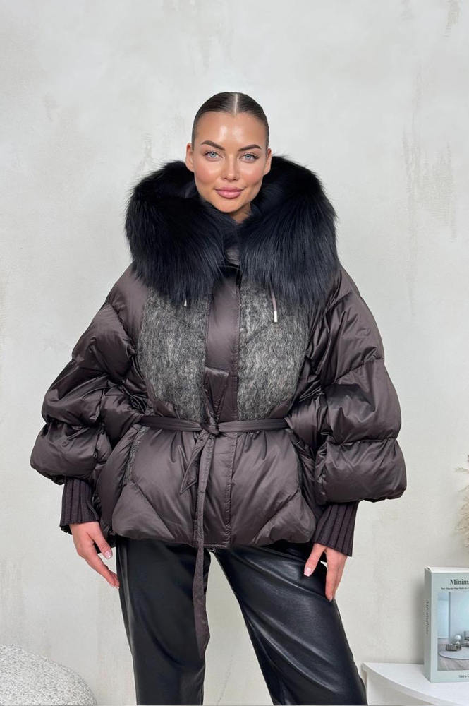Это коричневое пальто с меховым капюшоном из натурального меха чернобурки, который пристегивается к воротнику. Внутри пальто наполнитель из пуха и пера, обеспечивающий тепло и комфорт в холодную погоду. Крой модели — широкая юбка, создающая элегантный и женственный силуэт. Талия подчеркнута поясом, который позволяет подгонять пальто по фигуре для максимального комфорта и идеальной посадки. Отличный выбор для зимних дней, сочетающий тепло, стиль и практичность.