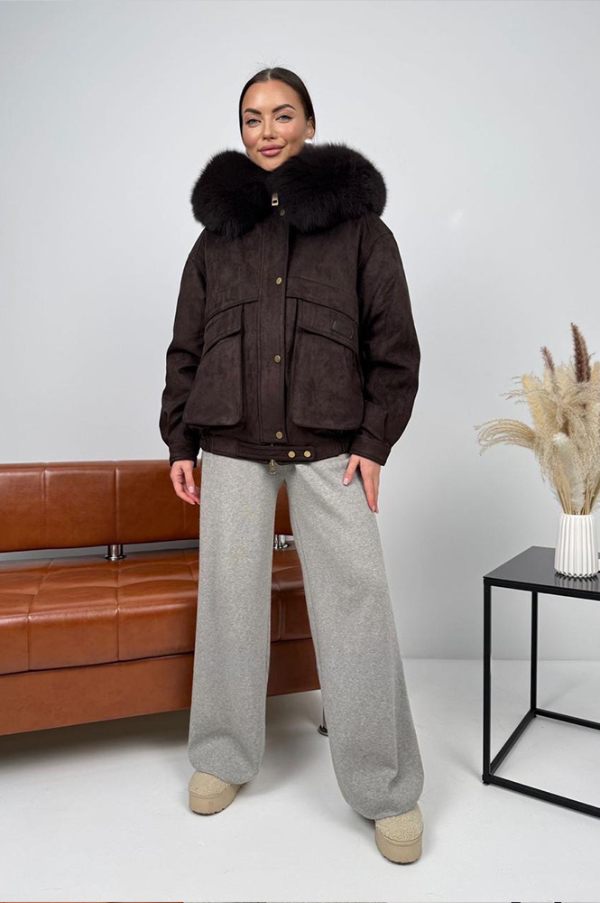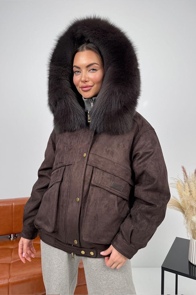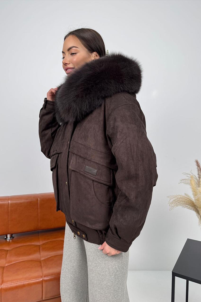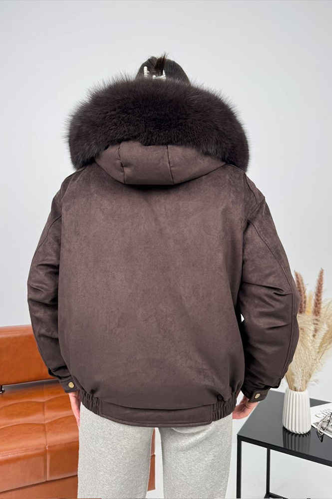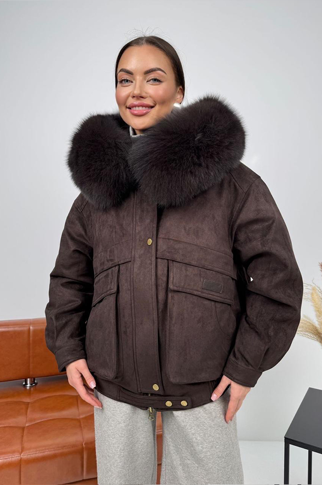 Короткий пуховик с мехом из эко-замши в модном коричневом цвете. Модель выполнена в стиле бомбера с капюшоном, украшенным натуральным песцом. Внутри утеплен пухом и пером для высокой теплоизоляции. Застежка на молнию и кнопки обеспечивает надежность и стильный внешний вид. Этот трендовый пуховик сочетает комфорт, тепло и современный дизайн, идеально подходит для зимнего сезона 2025-2026.