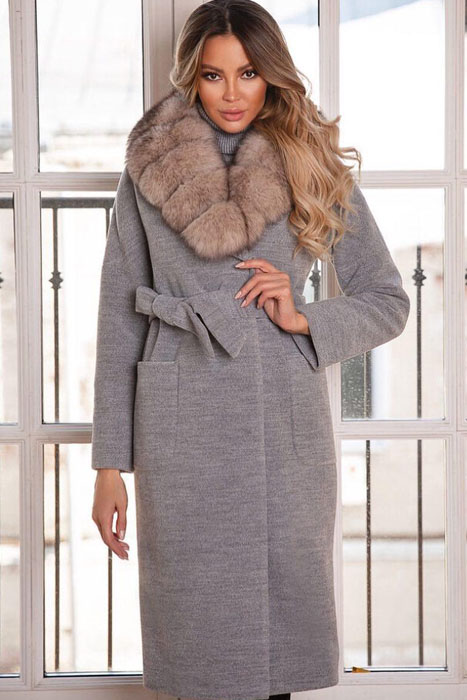 Пальто женское кашемировое длинное с мехом серое купить в Москве