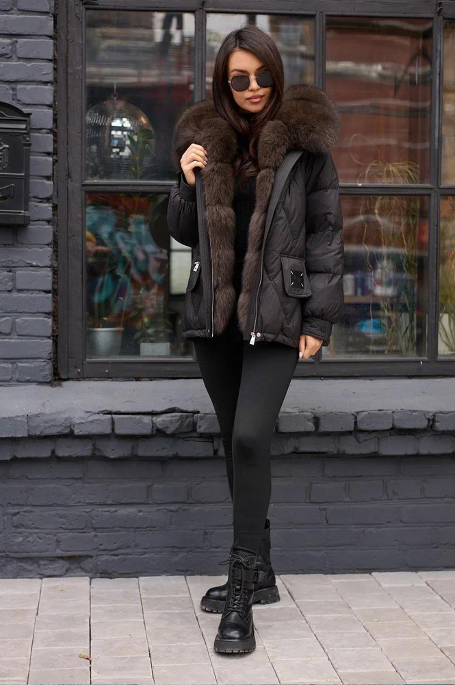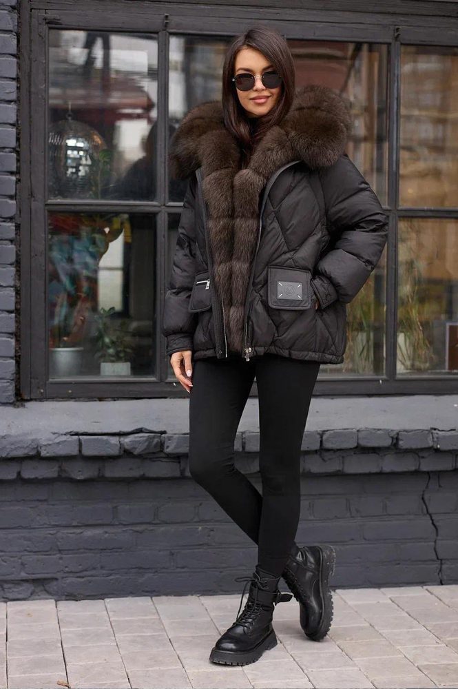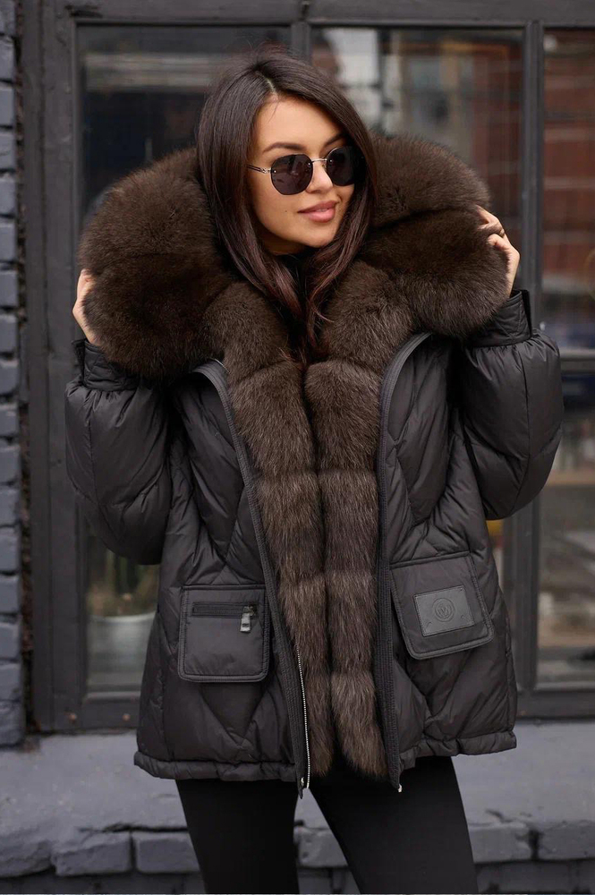 Объемный пуховик с мехом песца стеганный купить в Москве