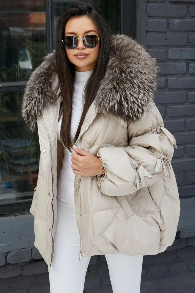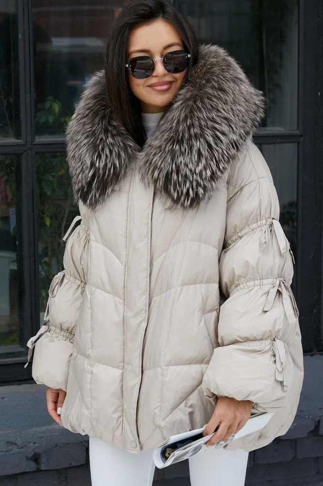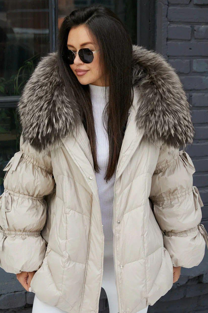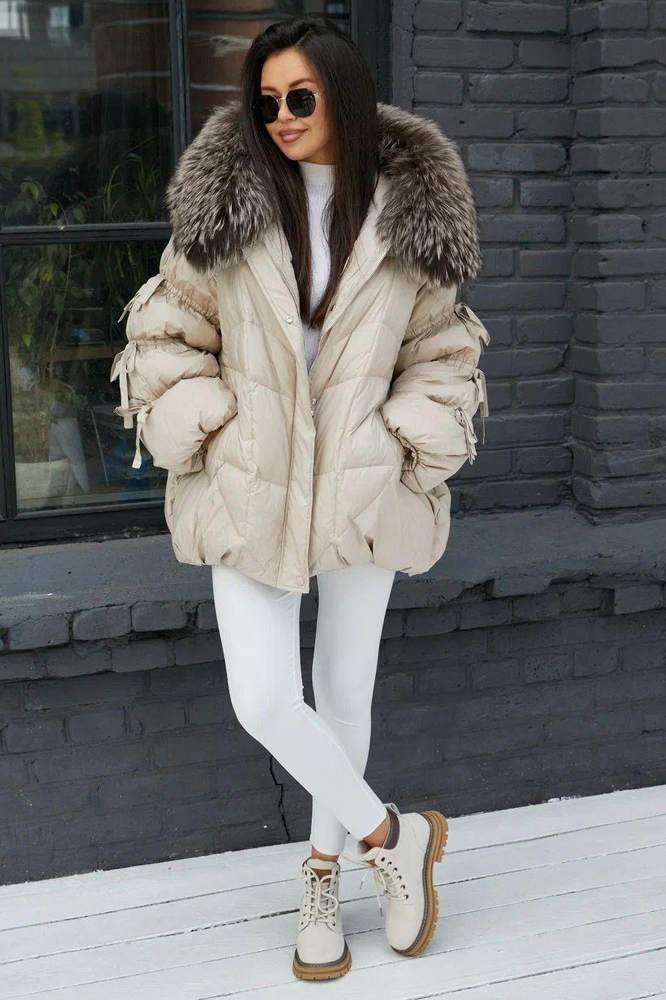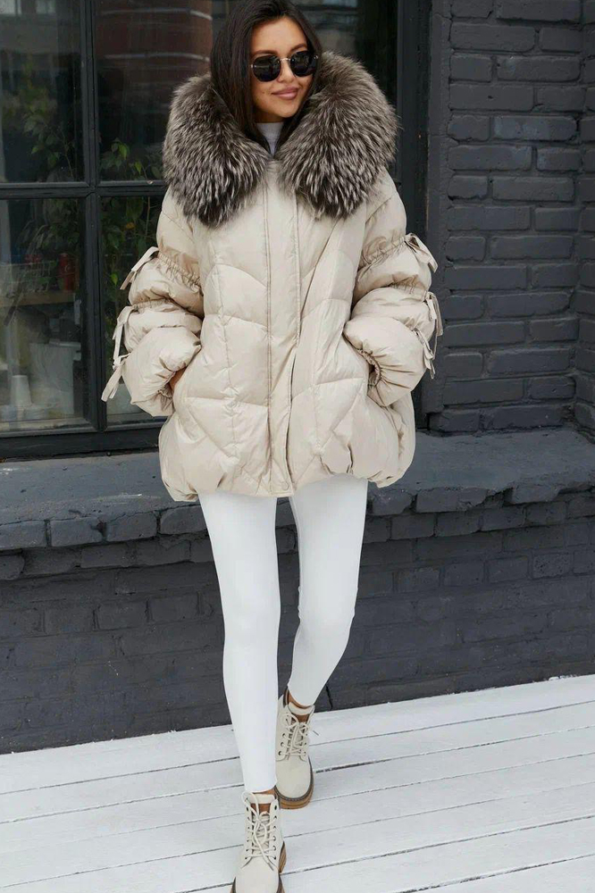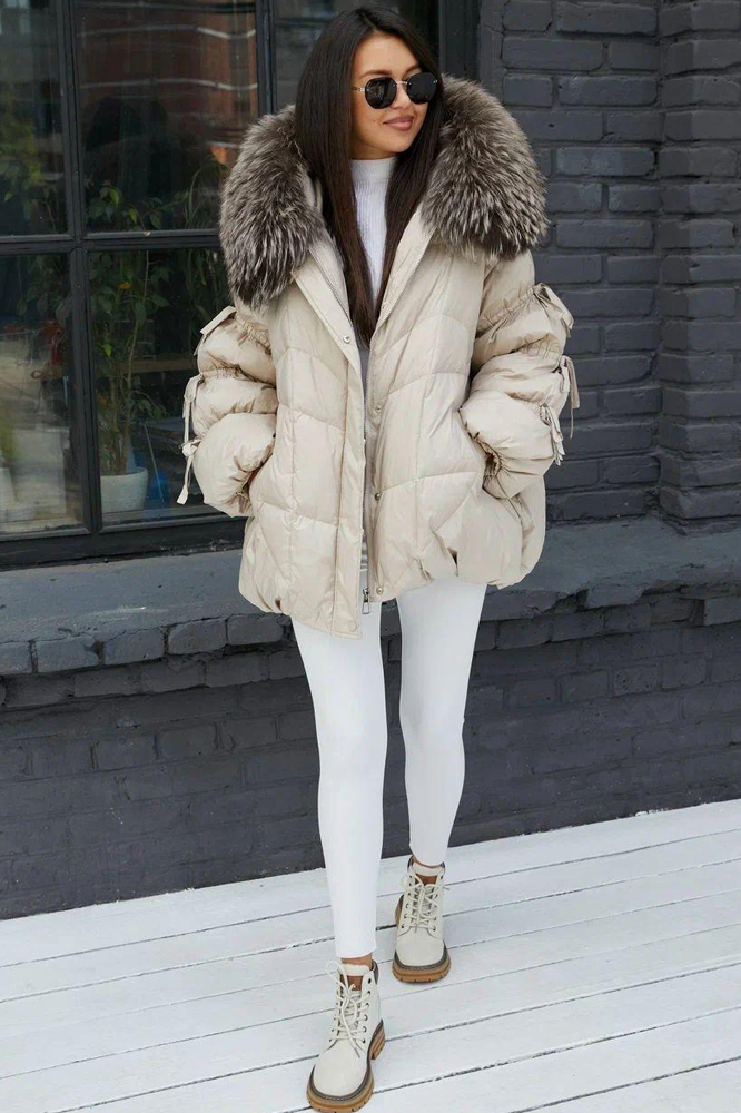 Приталенный пуховик с меховым воротником бежевый купить в Москве