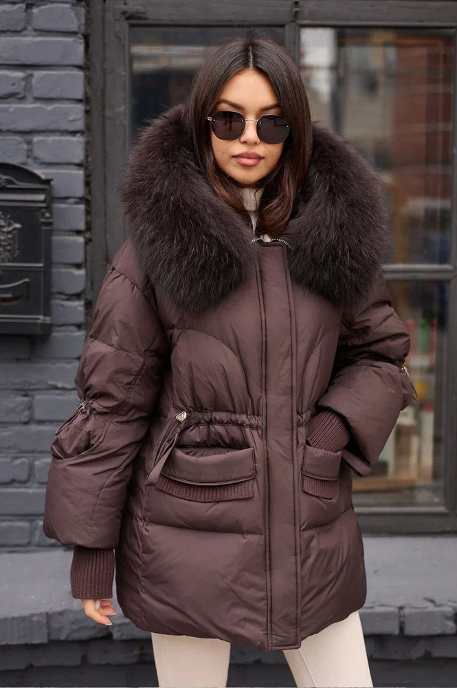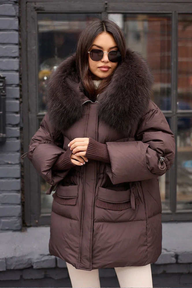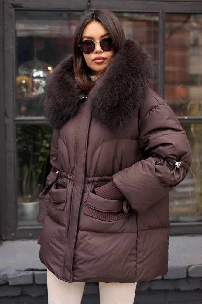 Женский зимний пуховик Pang Million коричневого цвета в свободном оверсайз-крое. Модель выполнена с приталенным силуэтом по переду, что создает стильный и современный образ. Рукава оснащены трикотажными манжетами, обеспечивающими комфорт и тепло. Капюшон украшен мехом внутри, что добавляет уют и изысканность. Наполнитель из пуха и пера гарантирует теплоизоляцию в холодную погоду. Этот пуховик отлично сочетает комфорт, функциональность и модный дизайн.