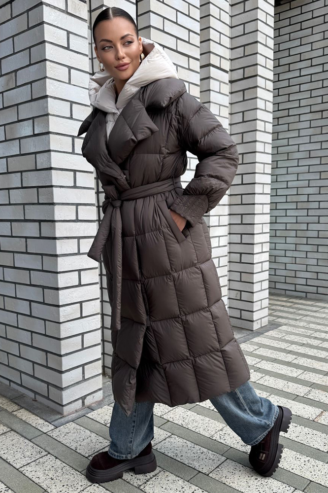 Женское зимнее длинное пуховое пальто Vivilona серого цвета с манишкой светлого оттенка. Модель выполнена из теплого наполнителя из пуха и пера, что обеспечивает отличную теплоизоляцию. Пальто оснащено поясом, который позволяет подчеркнуть талию и создать элегантный силуэт. Благодаря своему длинному крою и уютной манишке, оно отлично защитит от холода и ветра. Стильный и практичный выбор для зимних прогулок и повседневной носки.