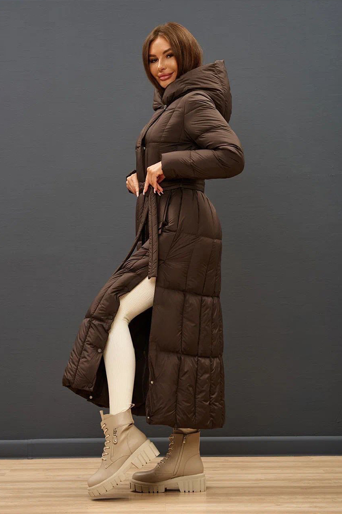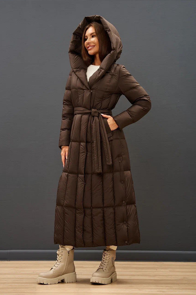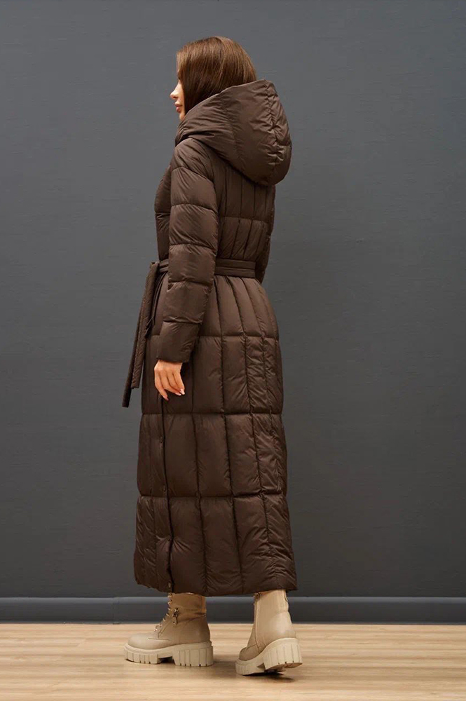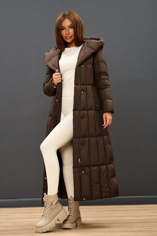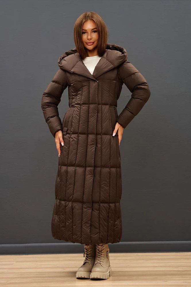 Зимний приталенный пуховик Vivilona в коричневом цвете, украшенный капюшоном. Стильное и теплое изделие идеально подойдет для холодных зимних дней.