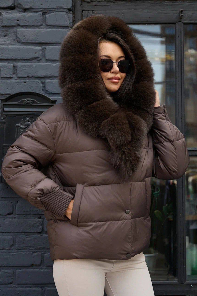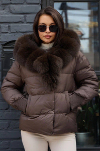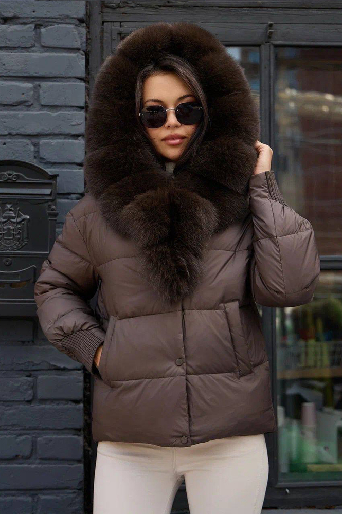 Зимняя пуховая куртка Vivilona коричневого цвета с мехом песца на воротнике и капюшоне. Надежная застежка — молния и кнопки. Удобные трикотажные манжеты обеспечивают тепло и комфорт в холодную погоду. Идеальный выбор для зимних прогулок.